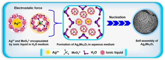 AgM was synthesized by dissolving 1 mmol of (NH4)6Mo7O24.4H2O (solution A) and 2 mmol of AgNO3.6H2O (solution B) separately in 50 mL of DI.H2O. Solution A was then added drop-wise to solution B under vigorous stirring at 80 °C for 30 min. Subsequently, 2 mL of previously synthesized 1-butyl imidazolium glycolate ionic liquid was added and centrifuged, washed with ethanol, and DI.H2O. The resulting product was then dried at 80 °C, yielding Ag2Mo2O7 nanoparticles, which were named as AgM.