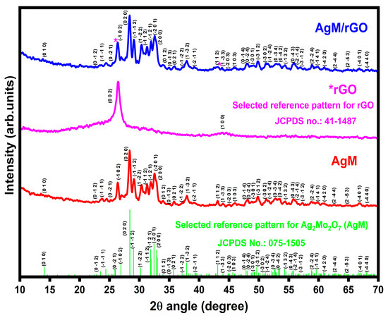 The crystal structure and phase purity of the as-prepared AgM, rGO, and AgM/rGO material were examined using XRD analysis, as shown in Figure 4. The AgM displayed diffraction peaks at 2θ angle of 14.1°, 23.5°, 24.4°, 25.9°, 26.9°, 28.4°, 29.1°, 30.2°, 31.8°, 31.9°, 32.4°, 32.9°, 33.9°, 35.1°, 35.8°, 37.1°, 37.9°, 39.3°, 43.1°, 43.9°, 44.9°, 45.6°, 48.1°, 48.8°, 49.6°, 51.0°, 51.4°, 52.7°, 53.2°, 54.3°, 55.6°, 55.7°, 56.7°, 58.7°, 59.5°, 60.8°, 62.8°, 64.9°, 66.7°, and 67.9° corresponding to the (0 1 0), (0 −1 2), (−1 −1 1), (0 −2 1), (−1 0 2), (0 2 0), (−1 −1 2), (1 −2 2), (−1 1 2), (−1 2 1), (−2 0 1), (2 0 0), (0 1 2), (0 −1 3), (0 2 1), (−1 −2 2), (1 −3 2), (−2 −1 1), (1 1 2), (1 −3 3), (−2 0 3), (1 0 3), (0 −2 4) (−3 0 1), (−3 1 2), (−3 0 2), (−1 −2 4), (0 −3 4), (0 −4 2), (−1 3 2), (0 −4 3), (−2 −1 4), (−3 −1 2), (2 −2 4), (−1 4 1), (−4 2 0), (2 −4 4), (2 −5 3), (−4 0 1) and (−4 4 0) planes, respectively. These peaks indicate an anorthic crystal system with a P-1 space group, confirmed by JCPDS no. 75-1505, validating an Ag2Mo2O7. Furthermore, no peaks corresponding to metallic Ag, AgO, Ag2O, Ag3O4, or MoO3 were observed, confirming the formation of coherent Ag₂Mo₂O7 material [11,12,21].