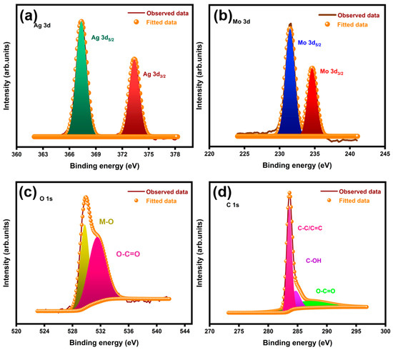 To analyze the specific electronic states and validate the chemical oxidation state of the as-prepared AgM/rGO composite material, XPS analysis was studied and the results are shown in Figure 5a–d. The results clearly show the presence of Ag 3d, Mo 3d, O 1s, and C 1s elements in AgM/rGO material. In Figure 5a, the high-resolution spectrum of Ag 3d shows two peaks for Ag 3d5/2, and Ag 3d3/2 at a binding energy of 367.38 eV and 373.39 eV. Generally, the spin-orbit Ag 3d can exist in two oxidation states such as monovalent silver ions (Ag⁺) and metallic silver (Ag0). The energy gap between Ag 3d5/2 and Ag 3d3/2 is 6.01 eV indicating the presence of higher oxidation states, confirming the existence of Ag2+ and the absence of ionic Ag⁺ and Ag0 in the sample [11,21].