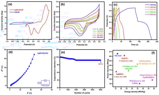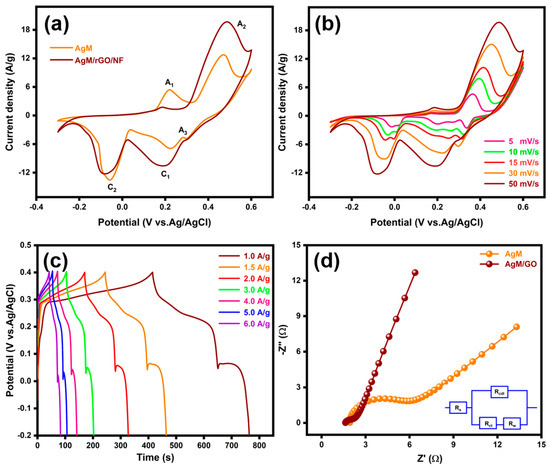The electrochemical behavior of the as-prepared electrodes was evaluated using a 3-electrode setup in a 3 M KOH electrolyte and the results are presented in Figure 6a–d. The CV curves of the as-prepared AgM/NF and AgM/rGO/NF electrodes were recorded at a scan rate of 50 mV/s within a potential window of −0.3 to +0.6 V, as displayed in Figure 6a. From the results, the AgM/rGO/NF electrode exhibits an enlarged CV area due to the transfer of improved electrochemical active sites provided by composited rGO, which helps to enhance the performance of the electrode [12]. This configuration increases the distance between the graphene sheets, which allows easier penetration of electrolyte ions [40]. As a result, enhanced ion transport leads to a higher current response, indicating a quasi-conversion reaction mechanism with efficient electron movement and favorable reversibility during the faradaic process [11].