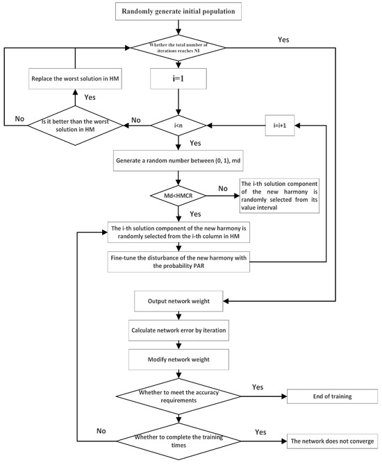- Coding: For the HS algorithm, the coding of its algorithm is usually real number coding in academic terms, and, in general, the parameters wij and θj are coded so that dimension m can be obtained by the algorithm, and the extracted harmonies will have the corresponding weights and thresholds.