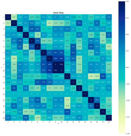 Before establishing the model, the correlation between the feature variables is also verified. If the feature variables have strong correlation, it will have a certain degree of impact on the generalization ability of the model. The correlation coefficient heatmap is drawn for each characteristic variable studied in this paper to observe the correlation degree of each characteristic variable. Firstly, the correlation coefficient between each characteristic variable is calculated by using the Corr function, then, the correlation coefficient heatmap is drawn by using the heatmap function in the seaborn plotting package in Python, as shown in Figure 3, and the correlation coefficient is calculated by using the heatmap function in the seaborn plotting package in Python.