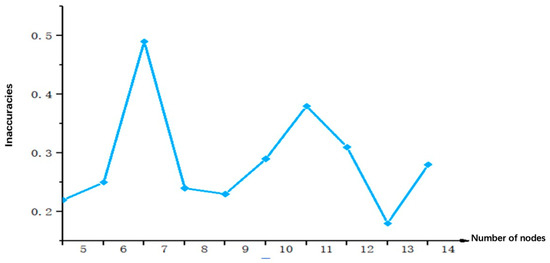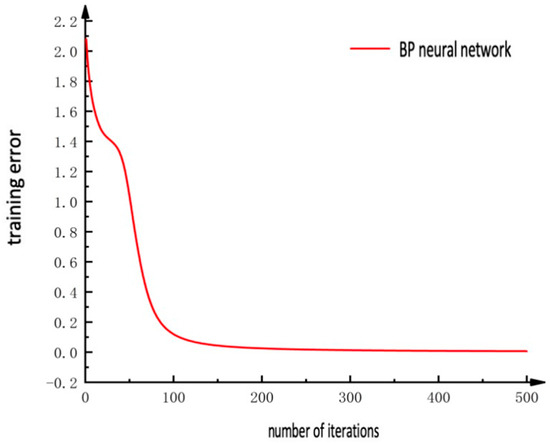 The optimal number of nodes in the hidden layer is obtained by bringing n = 4 and m = 12 into the empirical Equation (5). The calculation results show that the number of nodes lies between the interval [5,14], and each integer of the various kinds is tested one by one with the BP neural network. The results of the training error are shown in Figure 4.