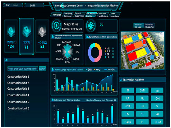 The research methodology system was experimentally applied in Zhangzhou Nuclear Power, mainly realizing behavioral risk control and the multi-scenario hidden danger investigation for 20,000 workers in the under-construction nuclear power plant. The application platform is shown in Figure 8, which displays the risk and hidden danger data of the whole working area in real time.