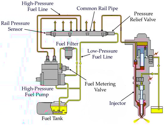 - Zhao, W.L. Simulation Research of Pressure Fluctuation in the Process of Fuel Supply and Injection for Common Rail System of Diesel Engine. Master’s Thesis, Beijing Jiaotong University, Beijing, China, May 2019. [Google Scholar]