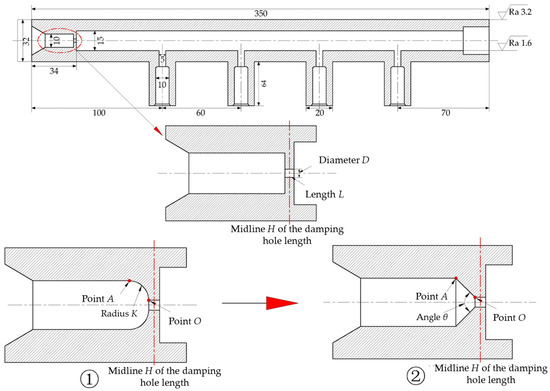A comparative analysis of different fuel inlet structures is conducted, focusing on ease of fabrication. The front-end structure of the damping hole can be classified into three types: cylindrical, arcuate, and conical. The analysis ensures that the volume of the damping hole remains constant while the inlet and outlet pressures of the common rail pipe are kept unchanged. To clearly compare the effects of the arcuate and conical structures on in-rail fuel flow and pressure, points O and A are fixed, and the arcuate variation is described by the radius K. As K gradually increases to ∞, the arcuate structure transitions into a conical structure (which can also be described by the cone apex angle θ, with θ equal to 90°).