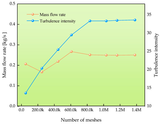 Simulation analysis was performed using Ansys2020 software. In this study, a tetrahedral mesh is used to simulate the common rail pipe runner model. Different numbers of meshes (50,000, 240,000, 440,000, 600,000, 830,000, 1,030,000, 1,160,000, and 1,400,000) are selected for the CFD fluid simulation to ensure the accuracy of the simulation. The values of mass flow rate and turbulence intensity in the common rail pipe are compared at different numbers of meshes to verify the effect of the number of meshes on the simulation results. As shown in Figure 4, the mass flow rate fluctuates considerably until the number of grids is 600,000, while it stabilizes beyond 830,000. The turbulence intensity gradually increases at grid numbers less than 830,000 and stabilizes when the grid number exceeds 1.03 million. Too few meshes will affect the accuracy of the simulation, and too many meshes will increase the time of computation, so a mesh number of 1,030,000 is chosen for the fluid simulation.
