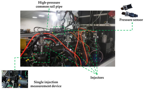 The experimental platform for the high-pressure common rail fuel injection system of a diesel engine is established, as shown in Figure 6. The test bench primarily consists of a fuel tank, filter, low-pressure pump, high-pressure pump, relief valve, common rail pipe, controller, sensors, data acquisition system, and display panel. This test bench is provided by Longkou Long Pump Diesel Injection Hi-Tech Co. (Yantai, China). It can perform injection flow characteristic tests and rail pressure characteristic tests of high-pressure common rail fuel injection systems. There is a pressure sensor at the common rail pipe to collect data on the rail pressure signal, which has a measuring range of 0.1–1800 bar and a comprehensive accuracy of ±0.1 F.S. The pressure sensor can also be used to measure the rail pressure. The injector outlet is equipped with an EFS8246 single fuel injection meter, measuring an accuracy of 0.6 mm3. The measurement range is 0–600 mm3 under each injection, which can be used for the measurement of injector injection volume.
