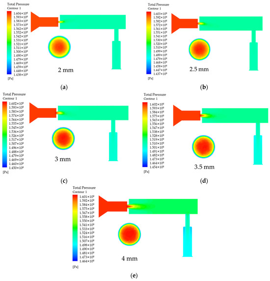 Effect of diameter D variation on pressure. (a) D is the pressure in the rail when 2 mm; (b) D is the pressure in the rail when 2.5 mm; (c) D is the pressure in the rail when 3 mm; (d) D is the pressure in the rail when 3.5 mm; (e) D is the pressure in the rail when 4 mm.