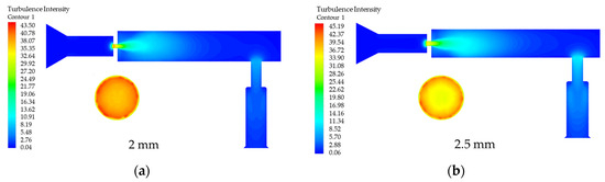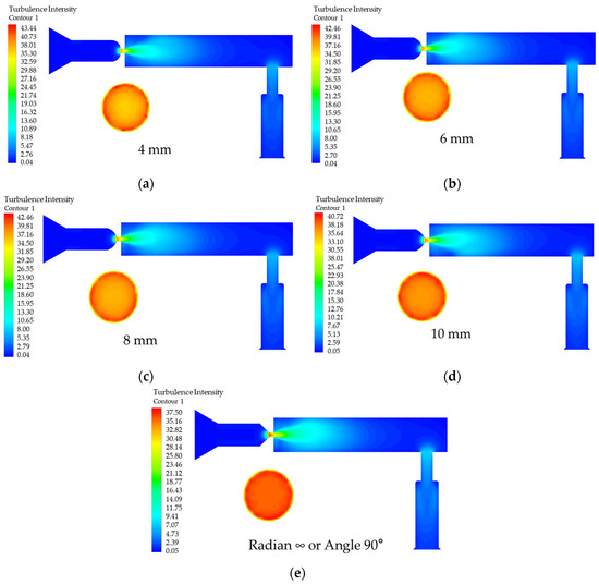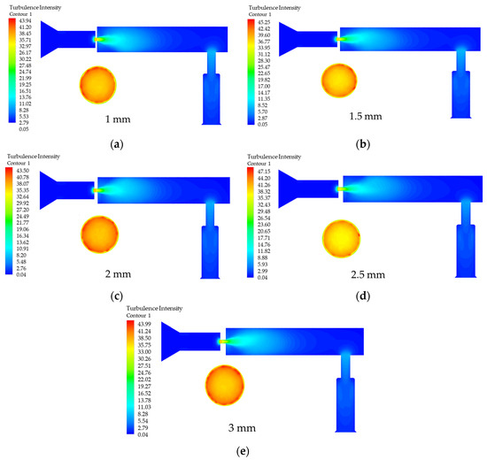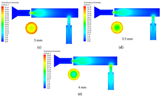 Effect of diameter D variation on turbulence intensity. (a) D is the turbulence intensity in the rail when 2 mm; (b) D is the turbulence intensity in the rail when 2.5 mm; (c) D is the turbulence intensity in the rail when 3 mm; (d) D is the turbulence intensity in the rail when 3.5 mm; (e) D is the turbulence intensity in the rail when 4 mm.