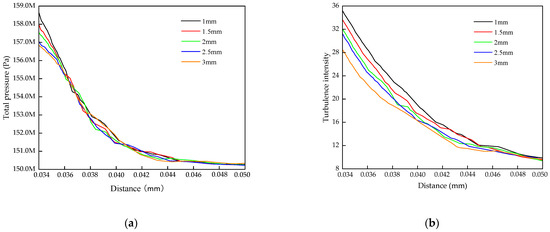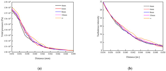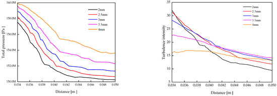 As shown in Figure 10a, the fuel pressure decreases as it enters the common rail pipe. At the 0.034 m position, the larger the D, the higher the fuel pressure at that position. The pressure tends to stabilize after the 0.048 m position, but the value when the pressure stabilizes increases with the increase of the D value. This indicates that the change in the value of D has an effect not only on the maximum pressure in the common rail but also on what value the pressure stabilizes at in the common rail. As shown in Figure 10b, the turbulence intensity shows an overall decreasing trend, and the decreasing rate decreases gradually with the increase of D. Numerically, the larger the value of D, the smaller the turbulence intensity at the 0.034 position.