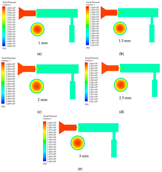 Effect of length L variation on pressure. (a) L is the pressure in the rail when 1 mm; (b) L is the pressure in the rail when 1.5 mm; (c) L is the pressure in the rail when 2 mm; (d) L is the pressure in the rail when 2.5 mm; (e) L is the pressure in the rail when 3 mm.
