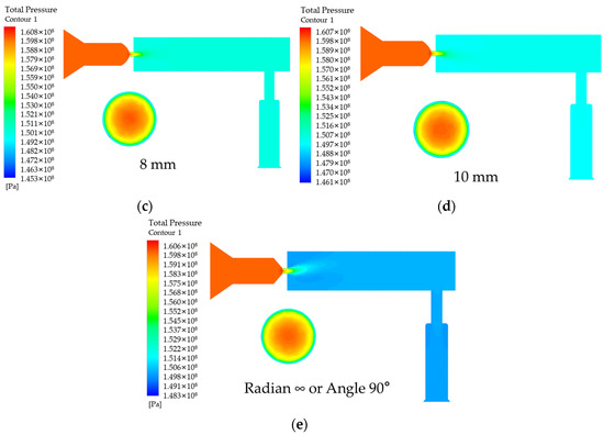 Effect of radius K variation on pressure. (a) K is the pressure in the rail when 4 mm; (b) K is the pressure in the rail when 6 mm; (c) K is the pressure in the rail when 8 mm; (d) K is the pressure in the rail when 10 mm; (e) K is the pressure in the rail when ∞.