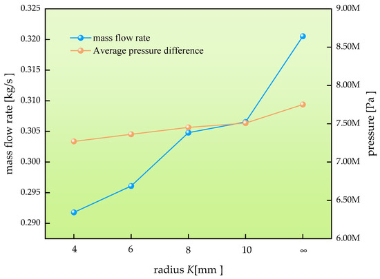 Curve of the effect of radius K on pressure difference and mass flow rate.