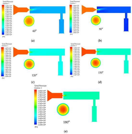 Effect of angle θ variation on pressure. (a) θ is the pressure in the rail when 60°; (b) θ is the pressure in the rail when 90°; (c) θ is the pressure in the rail when 120°; (d) θ is the pressure in the rail when 150°; (e) θ is the pressure in the rail when 180°.