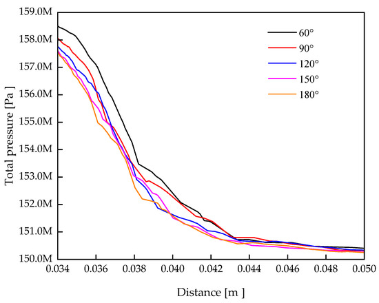As shown in Figure 18 and Figure 19, the pressure in the common rail pipe remains stable as a whole; the pressure tends to decrease in the interval from the 0.034 m to the 0.044 m position, and the rail pressure tends to be the same after the 0.044 m position; the pressure decreases the fastest when the θ value is 60°, and with the increase of the θ value, the maximal pressure of the common rail pipe decreases.