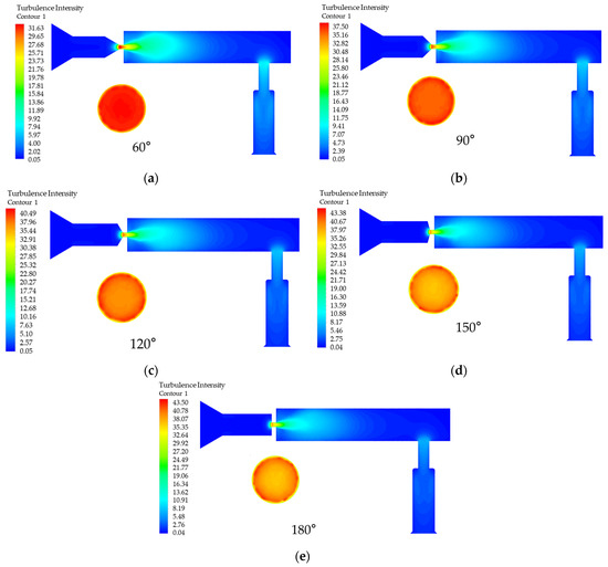 Effect of angle θ variation on turbulence intensity. (a) θ is the turbulence intensity in the rail when 60°; (b) θ is the turbulence intensity in the rail when 90°; (c) θ is the turbulence intensity in the rail when120°; (d) θ is the turbulence intensity in the rail when 150°; (e) θ is the turbulence intensity in the rail when 180°.