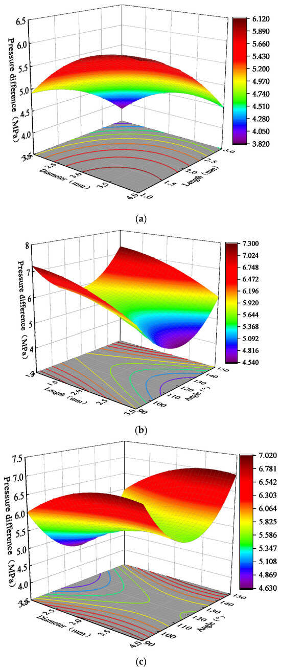 Effect of the interaction between two factors on the pressure difference value. (a) Effect of length and diameter interaction on pressure difference value; (b) The effect of length and angle interaction on pressure difference value; (c) Effect of diameter and angle interaction on pressure difference value.