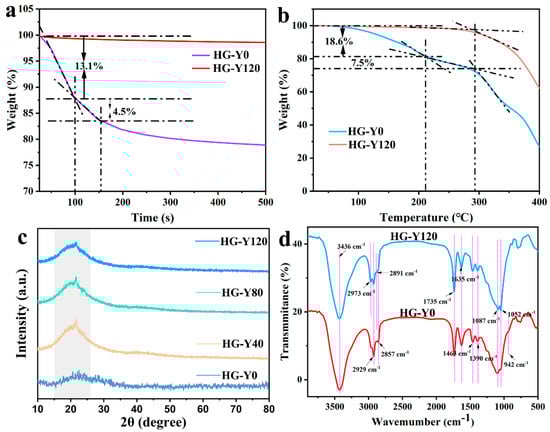 Weight loss of the dried passivation solution powders with time (a) and temperature (b) for both untreated (HG-Y0) and yellowing-treated samples (HG-Y120); XRD patterns (c) and FTIR spectra (d) of the dried passivation solution powders before and after yellowing treatment at different test times.