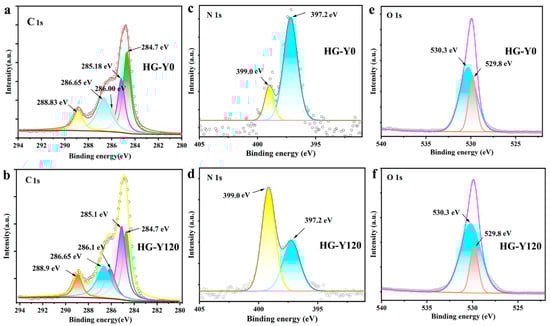 High-resolution XPS spectra of C 1s (a,b), N 1s (c,d), and O 1s (e,f) orbits for HG-Y0 and HG-120.