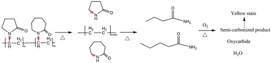 Based on TGA, FTIR, XRD, and XPS analyses, the possible decomposition and yellowing mechanisms of the copolymer of N-vinylcaprolactam and N-vinylpyrrolidone are proposed, as shown in Figure 3. When the temperature exceeded 100 °C, C-N bonds connected to the main chain in some lower molecular weight copolymers initially broke, generating caprolactam, α-pyrrolidone, and polyvinyl compounds. As the temperature increased, the sp³ C-N bonds in caprolactam and α-pyrrolidone underwent cleavage, leading to the ring opening of caprolactam and α-pyrrolidone, resulting in the formation of butyramide and pentanamide. When the temperature exceeded 210 °C, butyramide and pentanamide further pyrolyzed in the presence of O2, producing semi-carbonized products, carbon oxides, and water. The carbon oxides and water quickly escaped from the passivation film, forming gas pores within the network of the film, while the semi-carbonized products caused the passivation film to harden, shrink, and undergo yellowing.