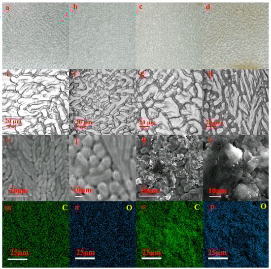 Optical photographs of the passivation film after yellowing tests at 0 (a), 40 (b), 60 (c), and 80 (d) min; metallographic images of the passivation film after yellowing tests at 0 (e), 40 (f), 60 (g), and 80 (h) min; SEM images of the passivation film after yellowing tests at 0 (i,j) and 80 (k,l) min; EDS surface scanning images of the passivation film after yellowing tests at 0 (m,n) and 80 (o,p) min.