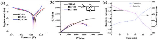 The corrosion potential and corrosion current density of samples subjected to different yellowing test durations at 240 °C were evaluated using the Tafel polarization curve. As shown in Figure 5a, the corrosion potential and corrosion current density of the untreated passivation film HG-Y0 were −0.663 V and 9.71 × 10−7 A cm2, respectively. In contrast, the sample HG-Y60, which underwent yellowing treatment for 60 min exhibited a corrosion potential of −0.667 V and a corrosion current density of 9.98 × 10−7 A cm2. For the sample HG-Y100 subjected to 100 min of yellowing treatment, the corrosion potential further decreased to −0.671 V, while the corrosion current density rose to 1.032 × 10−6 A cm2. The increase in corrosion current density and decrease in corrosion potential with greater yellowing indicates a gradual deterioration in the corrosion resistance of the HDAZCS coated with passivation film. Yellowing of the passivation film led to structural defects and fragmentation of the organic polymer networks on the surface of HDAZCS, facilitating the diffusion of corrosive gases and solutions through the passivation film. This interaction accelerated the corrosion process by allowing corrosive agents to reach the underlying aluminum–zinc layer, thereby degrading the corrosion resistance of the passivation film-coated substrate. The EIS spectra further confirm the degradation in the corrosion resistance of the passivation film (Figure 5b). The inset in Figure 5b presents the equivalent circuit that is suitable for modeling the experimental results, where Rs is the solution resistance, Qdl is the constant phase element (CPE) of the electric double layer between the passivation film and solution, and Rct is the charge transfer resistance. The fitted results of EIS reveal Rct values of 21,194 Ω, 6325 Ω, and 4009 Ω for specimens HG-0, HG-60, and HG-100, respectively. Generally, the Rct value is directly proportional to corrosion resistance []. As shown in Figure 5b, the rapid decrease in the Rct value with the progression of the yellowing test demonstrates a significant degradation in the corrosion resistance of the passivation film. Figure 5c illustrates the relationship between the resistivity and conductivity of the passivation film and the duration of the yellowing test. It is clear that as the duration of the yellowing test increased, the resistivity of the passivation film decreased while the conductivity correspondingly increased. This change is attributed to the gradual cracking of the passivation film over time, which exposed more of the aluminum–zinc layer and thus raised conductivity. Furthermore, with extended yellowing treatment, the passivation film experienced dehydration, leading to the formation of semi-carbonized products that had higher conductivity, thereby further contributing to the increase in the conductivity of the passivation film.