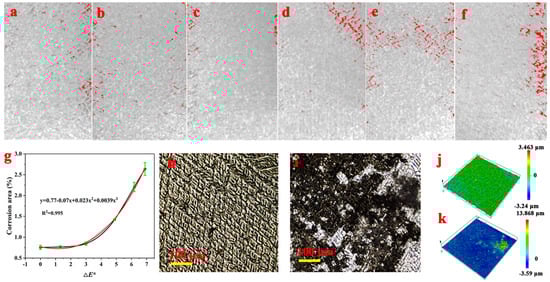 Optical images of samples with varying yellowing degrees after 72 h of salt spray corrosion testing (a–f); correlation curve between color difference ΔE* and corrosion area (g); metallographic images of samples HG-Y0 (h) and HG-Y100 (i) after 72 h of salt spray corrosion testing; laser confocal images of samples HG-Y0 (j) and HG-Y100 (k) after 72 h of salt spray corrosion testing.