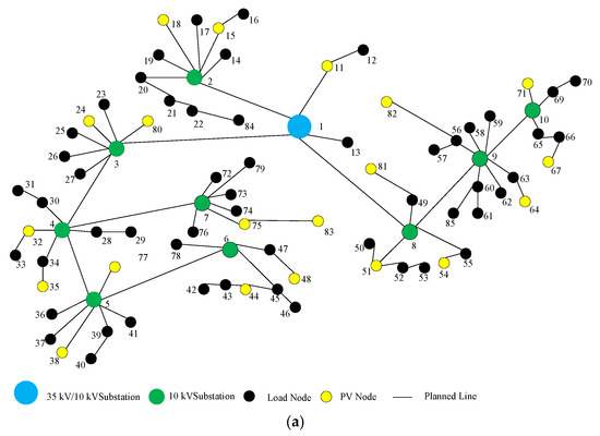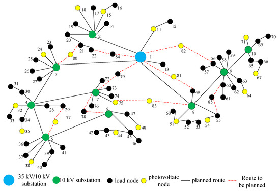 Existing DN planning strategies typically involve reinforcing or expanding the network infrastructure [21], including distributed generation (DG) systems actively managed to optimize outputs [22]. For example, the authors of [23] proposed an extended planning method for electric vehicle parking facilities, while [24] introduced an integrated planning model for power and gas systems structured in two stages: “demand accessibility assessment” and “comprehensive planning”. The authors of [25] propose a distribution network planning method based on power reliability using an ant colony algorithm. The process is divided into two layers: the upper layer focuses on network planning, while the lower layer calculates reliability indices. The two layers iteratively solve the problem to ensure the accuracy of the planning results.