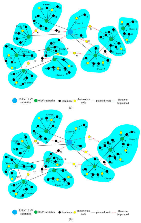 The comprehensive cluster partition index for the distribution network is represented by , where , and denote the respective weights assigned to each individual index. The desired cluster partition results can be achieved during the partitioning process by adjusting the weights of each index according to the decision maker’s preferences or specific requirements.