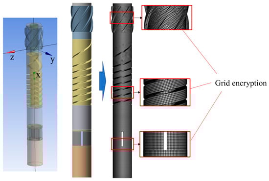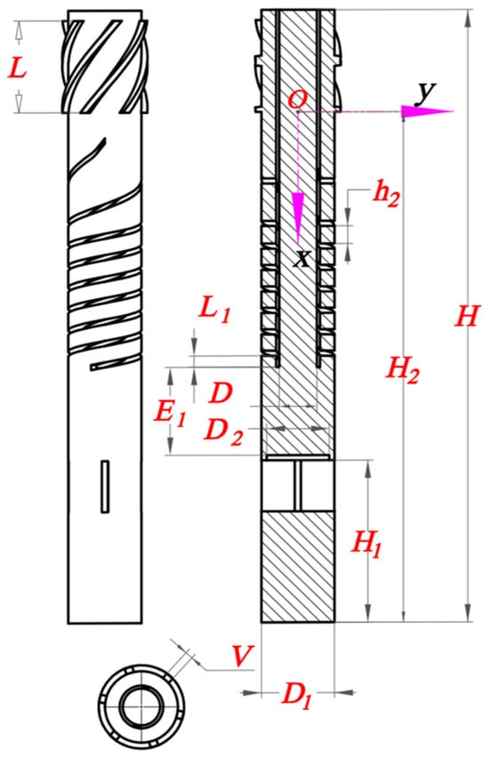 The in situ separation of hydrates under actual working conditions is highly complex. To manage the computational demands of a full simulation, the separator model is simplified. During gas hydrate extraction, the mixture includes gas hydrate, seawater, mud–sand, and additional impurities like seabed sediments. However, in the numerical simulation, only seawater, mud–sand, and gas hydrate are considered as primary phases. Given that the density of fragmented gas hydrate is similar to seawater and the hydrate particles are dispersed within the seawater, the mixture is treated as a continuous medium in the flow field simulation. To reduce computational complexity and eliminate extraneous variables, components such as the centering bracket and fixed ring are omitted, simplifying the model, as shown in Figure 1. The main geometric parameters of the spiral-swirl coupled in situ separator are shown in Table 1.