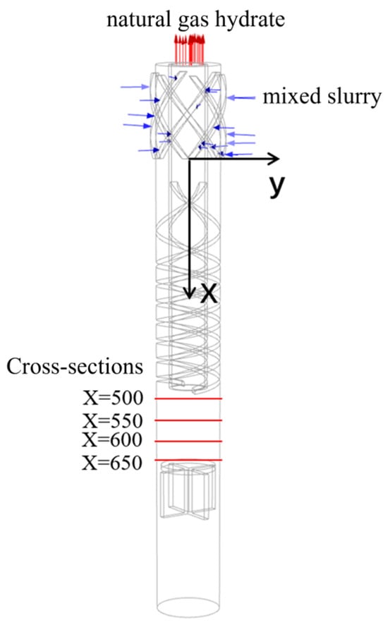 The in situ separator designed in this study utilizes a spiral-cyclone coupling principle for separation. The spiral-cyclone flow field is concentrated around the vortex deflector plate and between the spiral runner, where the separation of natural gas hydrate and silt sand particles occurs, along with the partial bond breaking of the hydrate. Thus, a detailed analysis of both the helical section and the cyclone region is essential. This area, as illustrated in Figure 3, extends from x = 500 mm to x = 650 mm in the x-direction. Cross-sections at x = 500 mm, 550 mm, 600 mm, and 650 mm are examined to assess the distribution of the velocity field, pressure field, sand phase, and hydrate phase within the spiral-cyclone separator.