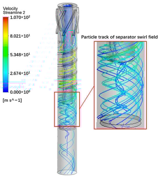 Verifying particle trajectories within the spiral-cyclone flow path is essential. This study uses the discrete phase model (DPM) with the Euler–Lagrange method to analyze these trajectories in the separator. As shown in Figure 4, the fluid efficiently separates gas hydrate and sediments between x = 500 mm and x = 650 mm, aligning with design specifications. The figure also indicates that density variations and the vortex deflector plate create two distinct cyclonic flows: an upward flow for intermediate-light fluids and a downward flow for heavy-phase fluids, driven by centrifugal forces. These findings confirm that the separator meets the design requirements for effective spiral-cyclonic flow trajectories.