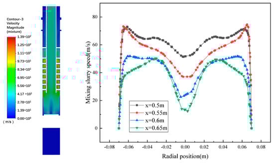 The mixed slurry velocity reflects the fluid’s overall movement within the separator, as shown in Figure 5. The cloud diagram highlights notable velocity variations in the spiral runner section, which generates a helical-cyclonic flow within the x-coordinate range of 500 mm to 650 mm. The relative velocity distribution curves at different radial cross-sections, also depicted in Figure 5, exhibit an ‘M’-shaped symmetrical distribution. The slurry near the wall of the baffle can obtain a larger flow rate and then obtain a larger centrifugal force. Therefore, high-density mud–sand flows to the wall, and low-density natural gas hydrate flows to the center, realizing the separation of natural gas hydrate and mud–sand. Specifically, the slurry velocity is lower near the separator’s axis and higher near the wall. Between radial positions of ±0.6 m and ±0.7 m, the velocity decreases sharply due to the wall’s influence, with a significant reduction near the wall.