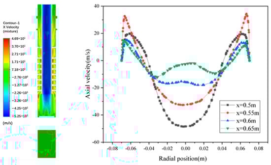 The axial velocity indicates the fluid flow direction within the separator, as depicted in Figure 6. Positive values signify the inflow of mixed slurry into the separator, while negative values represent the outflow of purified natural gas hydrate from the central region. Analysis reveals that in the x-direction segment between 500 mm and 650 mm, the axial velocity increases as the distance from the wall decreases. Figure 6 supports this finding, showing that the axial velocity rises closer to the wall, which aligns with the observed separation and sedimentation of high-density mud and sand.