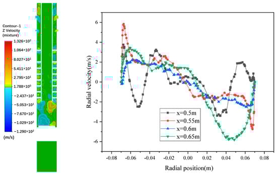 The radial velocity’s magnitude reflects the fluid’s movement relative to the separator’s axis, with positive and negative values indicating direction. As shown in Figure 7, radial velocity experiences more significant fluctuations than tangential and axial velocities. Notably, in the x-direction region from 500 mm to 650 mm, these fluctuations are especially pronounced, highlighting substantial radial migration influenced by centrifugal force. Figure 7 also illustrates how radial velocity varies at x-coordinates of 500 mm, 550 mm, 600 mm, and 650 mm.