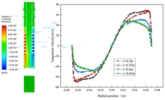 Centrifugal force and tangential acceleration in the separator exhibit a quadratic relationship, with centrifugal force as the primary determinant of separation efficiency. The separator utilizes centrifugal separation driven by density variations, causing the separation medium to migrate radially outward from the center. Figure 8 reveals a pronounced gradient in the distribution of tangential velocity within the separator. The cloud diagram shows that positive and negative values represent the direction of tangential velocity, with the magnitude being greater near the walls and lower in the central region. Enhanced tangential velocity near the walls amplifies the centrifugal force on the mixed slurry, thereby increasing the separator’s efficiency in separating sand from mud. The radial distribution curve of tangential velocity in Figure 8, at the x-coordinates of 500 mm, 550 mm, 600 mm, and 650 mm, shows that tangential velocity significantly exceeds radial and axial velocities, highlighting its essential role in separating natural gas hydrate from silt.
