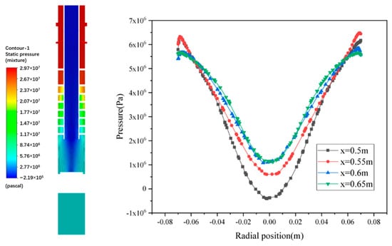 Figure 9 illustrates that pressure rises with increasing distance from the central axis of the separator and decreases as one approaches the axis, sometimes leading to regions of negative pressure. During the separation process, static pressure aids in the transport of sediment and natural gas hydrate phases, while negative pressure regions induce an upward suction of hydrate and sediment particles. The static pressure distribution curve presented in Figure 9 reveals an axisymmetric distribution across cross-sections at x-coordinates of 500 mm, 550 mm, 600 mm, and 650 mm.
