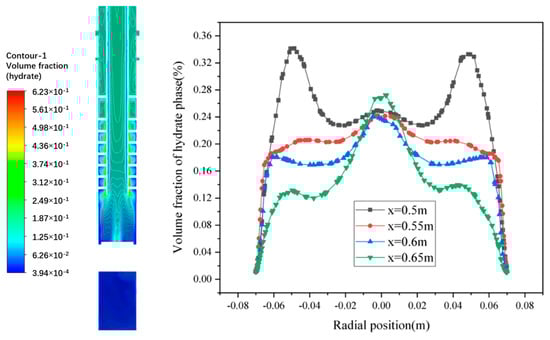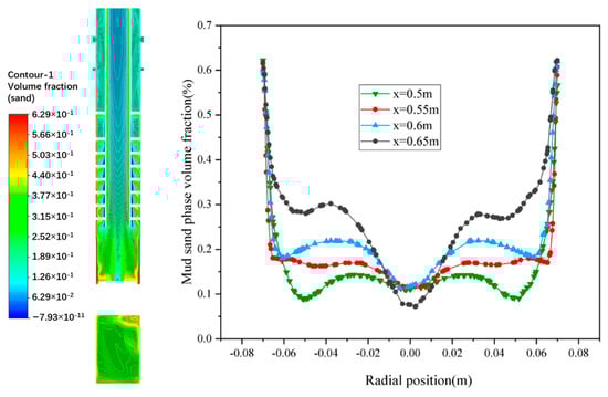 Figure 10 serves as a critical visual reference for evaluating the separator’s efficiency in isolating heavy-phase silt. The silt distribution cloud diagram illustrates that a segment of the silt phase is segregated within the spiral runner area and concentrated along its wall due to centrifugal forces. Along the x-direction, across cross-sections from 500 mm to 650 mm, the separation of the silt phase is more distinct, with the silt descending along the wall. The silt phase distribution curve, depicted in Figure 10, demonstrates the dynamic behavior of the silt phase along the radial position within the separator. This flow field pattern is crucial for optimizing the separator in future applications. The observed distribution validates that the in situ separator developed in this study effectively segregates sediment from hydrate.
