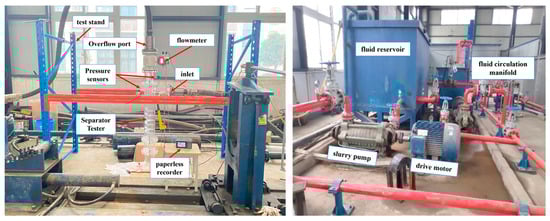 The experimental system is shown in Figure 12. During the experiment, the mixed slurry enters the separator from the lateral inlet, and a flowmeter is set at the inlet. The separated mud–sand flows downward and settles at the bottom of the separator, and the purified hydrate flows upward and recycles from the overflow pipe. The design flow range of the pump is 25 m3/h, and the volume concentration of the solid flow is between 5% and 15%.
