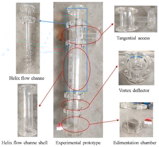 To facilitate the clear observation of the experimental phenomena in the spiral-cyclone in situ separator, the separator is made of high-strength Plexiglas (acrylic). Figure 13 shows the experimental prototype machining of the components; due to the separator using a split design, only the geometric optimization needs to be processed separately, while the spiral flow channel, vortex deflector, cyclone inlet, separator shell, and sedimentation chamber, the other parts, do not have components that need to be optimized or changed and can be replaced.