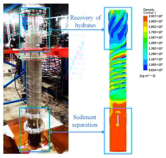 Natural gas hydrate (NGH), often termed ‘combustible ice’, is recognized as a promising clean energy source due to its extensive reserves. Estimates indicate that the global reserves of methane within natural gas hydrate resources amount to approximately 3 × 1015 m3 [1,2,3]. In the quest for carbon neutrality, natural gas hydrates are emerging as a viable and eco-friendly fuel, potentially bridging the gap between renewable energy supply and demand [4]. Current extraction methods include depressurization, CO2 replacement, chemical inhibitors, and thermal excitation [5,6,7,8,9]. However, these methods face wellbore safety hazards, production control, and environmental risks. A downhole in situ separation technology based on solid fluidization has been developed to overcome these issues, showing promising results in trials in the South China Sea [10,11]. This process involves using a high-pressure water jet to disintegrate the hydrate reservoir, creating a hydrate slurry. The slurry is then processed by a downhole separation device integrated into the pipeline, with the purified natural gas hydrate being pumped to the surface for controlled decomposition. The effective separation of mud and sand from the hydrate slurry is therefore essential [12,13]. However, the process of natural gas hydrate exploitation faces a problem, in that a large amount of sand production leads to the termination of production tests; these mud–sands are mostly silt, with a large particle size span, and some of the mud–sand particle sizes reach micron level. Most of the existing separators are cyclone separators or spiral separators. Cyclone separators have high separation efficiency [14], but are poor at separating particles with a particle size of 1~10 μm [15]. The spiral separator also has a good separation effect on small particles [16,17,18,19,20].