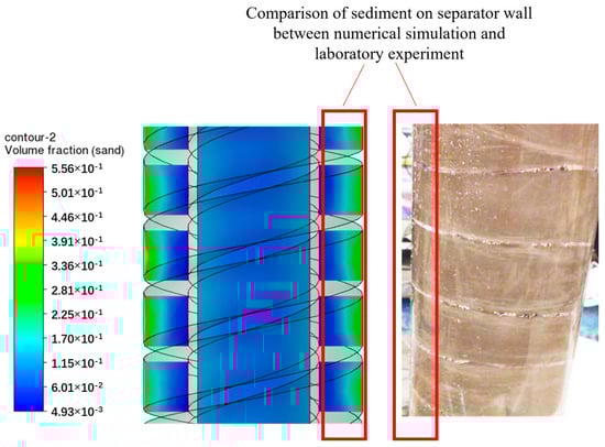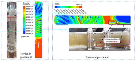 Large particles in the separation by gravity are more obvious. To study the impact of large sand particles on the separation effect in the actual experimental process, with the addition of quartz sand, and also in the circulating water tank, a small amount of large-size sand particles with a particle size of about 1 mm was added in order to observe this in the separator at different operating attitudes. This was to discover whether the large size of the sand particles has an effect on the separation. As shown in Figure 16, when the separator is placed vertically, the experimental results and the simulation cloud show that the sand is separated and settles to the bottom of the separator. When the separator is placed parallel to the ground, a unilateral accumulation of sediment is formed due to the influence of gravity, but sediment also accumulates at the bottom of the separator. Therefore, the above two cases show that the separator has good performance in separating mud and sand at different operating postures.