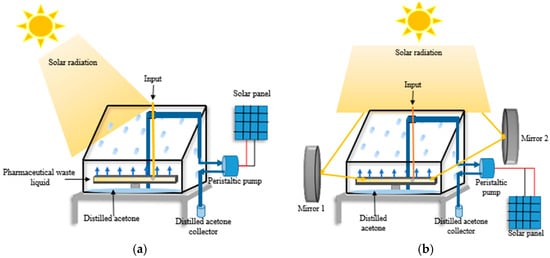 Operating principle: The distiller was oriented towards the equator to maximize solar radiation capture, which was absorbed by the tray. In the case of Figure 1b, the mirrors enhanced the temperature through solar concentration, directing heat towards the container to raise the temperature of the pharmaceutical residual liquid inside. Following the evaporation–condensation, the recovered solvent was pumped to the outlet and collected in containers (the blue arrows indicate the route followed by the distilled acetone recovered in the still until it reaches the collector).