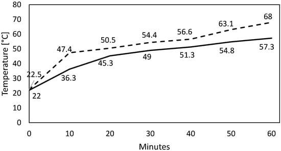 Figure 2 shows the data obtained from the distillation treatment with and without solar concentration. In both cases, the temperature starts at 22 °C and increases, reaching a maximum value of 68.0 °C with solar concentration and 57.3 °C without concentration, within 60 min. At this point, the distilled volume was collected and measured in a test tube, obtaining 200 mL for the first experiment and 213 mL for the second, from a 250 mL sample. The reported efficiencies were 80 and 85%, respectively. It is important to note that the solar concentration parameter resulted in a 5% decrease in efficiency, as the temperature exceeded the boiling point of acetone, causing part of it to evaporate rather than condense within the distiller, due to a reduced temperature differential.