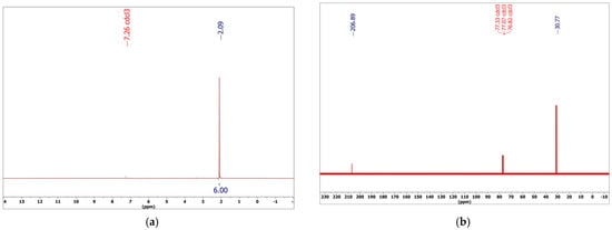 Figure 3 shows the NMR spectrum of distilled acetone, where a peak at 2.09 ppm can be observed (Figure 3a, 1H NMR spectrum), which corresponds to the CH3 of acetone. In the 13C NMR analysis (Figure 3b, 13C NMR spectrum), the aliphatic carbon of the CH3 group is distinguished at 30.77 ppm, while the C=O is located at 206.89 ppm. It should be noted that no additional signals were detected that indicate a purity higher than 84%.