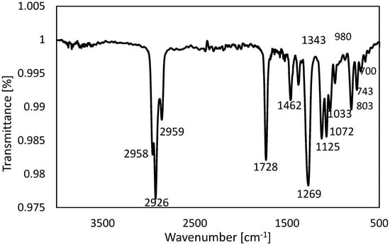 The structural analysis of the distilled acetone obtained by solar distillation is shown in Figure 4. Absorption bands at 2958, 2926, and 2859 cm−1, corresponding to the deformation of the C-H bonds in the CH3 groups, can be observed. Additionally, peaks at 1728 cm−1 indicate C=O interactions (ketone), while peaks at 1462 and 1376 cm−1 correspond to CH3 vibrations. Peaks were also recorded at the wave numbers of 1269 and 1072 cm−1 associated with the C-H bond, as well as at 1125, 1033, and 980 cm−1, attributed to the C-C bond. This is a common characteristic of simple ketones like acetone, typically appearing in this region due to the interactions between carbonyl and methyl groups. Finally, peaks at 803, 743, and 700 cm−1 correspond to the CH bond.