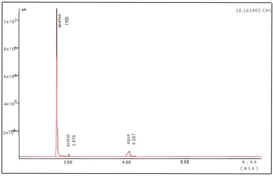 An Agilent 6890 gas chromatograph equipped with a flame ionization detector (FID) and thermal conductivity detector (TCD) was used to determine the different volatile components of the distilled acetone. The analysis conditions were AT-AQUAWAX Column: 30 m × 0.25 mm × 0.25 µm, Temp: 150 °C and FID Temp: 200 °C, and oven ramp: starting at 40 °C [3 min] at 10 °C/min up to 70 °C.