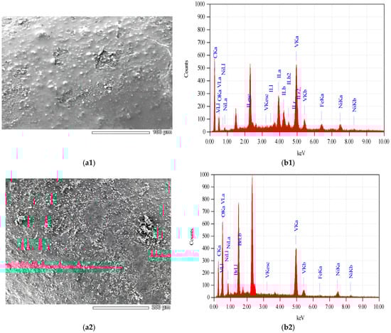 Figure 6a1,a2 present SEM micrographs showing the morphology of the catalyst surface before and after treatment for hydrocarbon removal using acetone recovered through solar distillation. The images reveal the presence of some compounds adhering to the catalyst surface. After treatment with acetone and subsequent calcination, a slight physical change is observed on the surface. The corresponding energy-dispersive spectra (Figure 6b1,b2) indicate that the untreated catalyst contains a high carbon content of 78.92% associated with hydrocarbons. Following treatment, the carbon content decreases by 29%, as evidenced in the spectra before and after treatment. The spectra also reveal the presence of S, V, and Fe peaks. These results align with previous studies, which report the deposition of V and S from heavy crude oil onto the catalyst during the reaction, contributing to its reduced lifespan [,]. Furthermore, the presence of Br was detected, likely captured during calcination, as it is presumed that the muffle furnace was contaminated prior to the analysis.