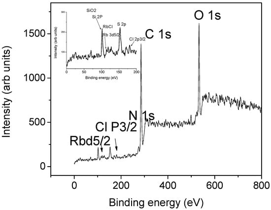 The solid residue from the distillation was characterized by XPS, where broad spectra ranging from 0 to 1100 eV of binding energy and narrow spectra collected in the high-resolution mode for each element were identified in the sample. The 284 eV shift caused by sample charging was corrected using the peak attributed to adventitious carbon. The broad spectrum (Figure 7) revealed the presence of elements such as Si, Rb, S, O, Cl, N, and C (Figure 8a–d), most of which are related to the clonazepam molecule. It is assumed that Rb originates from pharmaceutical residue. Rb 3d5/2, identified at 108.5 eV of binding energy, is associated with chloride in its chemical environment.